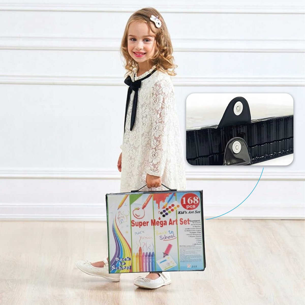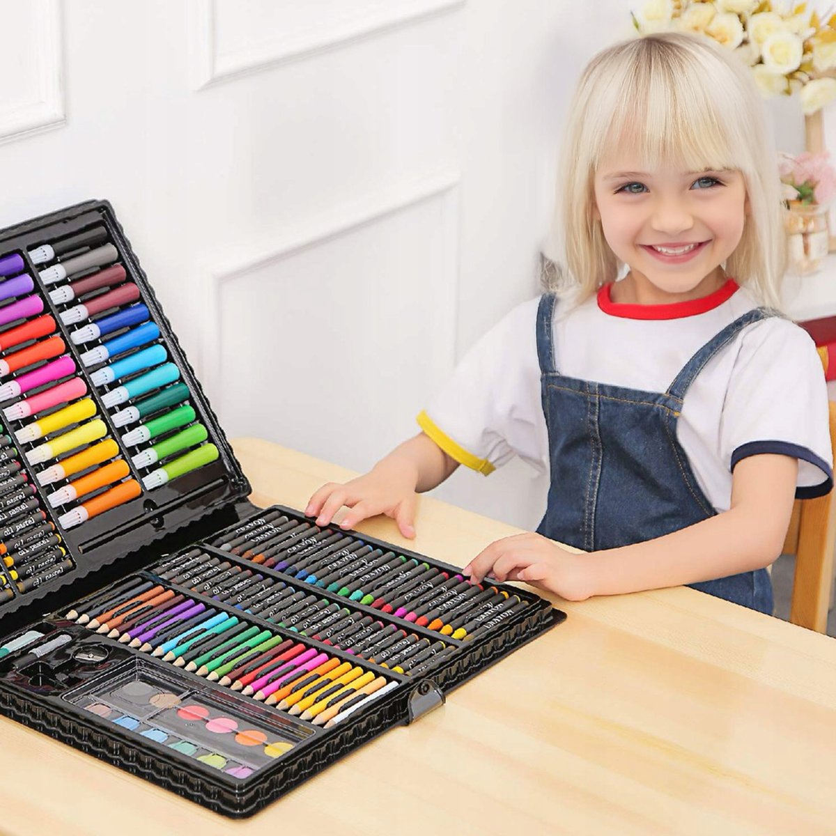 Wszystkie elementy zestawu są zapakowane w solidną, przenośną walizkę. Dzięki temu Twoje dziecko może łatwo zabrać swoje artystyczne przybory do szkoły, na wakacje lub do przyjaciół. Walizka pomaga również w utrzymaniu porządku – koniec z rozsypanymi kredkami czy flamastrem bez zatyczki!