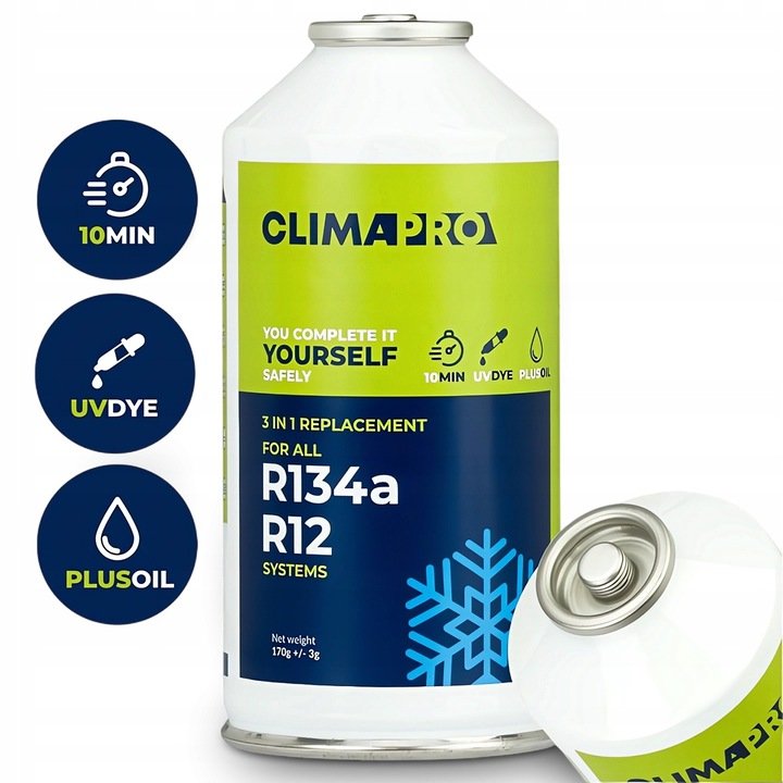Puszka czynnika chłodniczego ClimaPro 3w1 (1x 170 g) do samochodów z gazem R134a / R12 w układzie