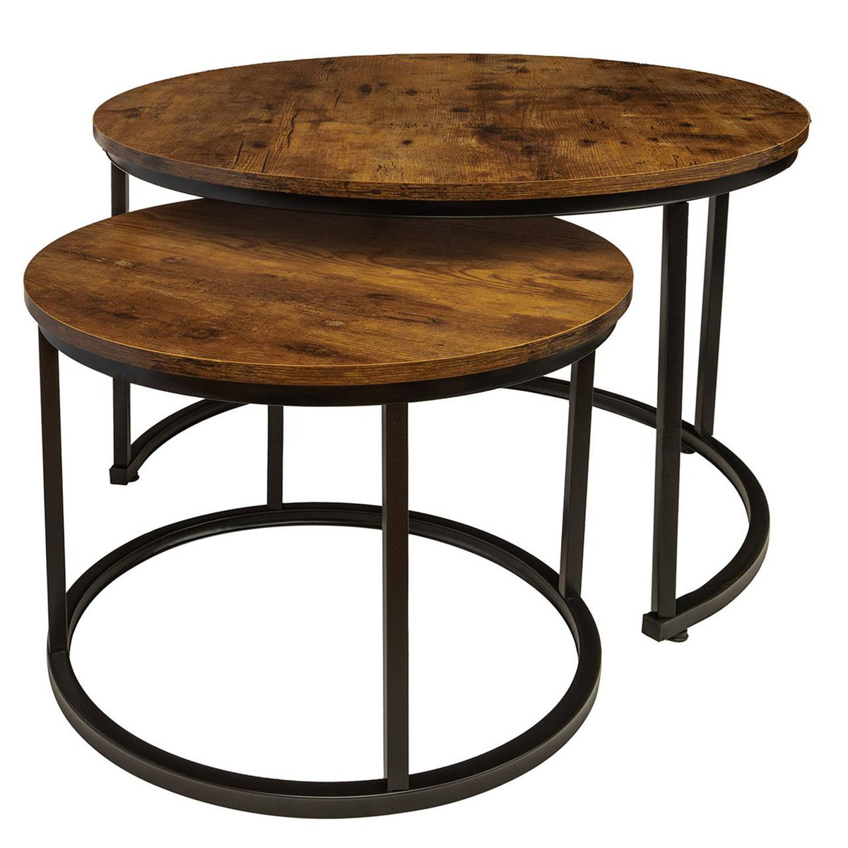 Nowoczesny zestaw dwóch okrągłych stolików kawowych to praktyczne i stylowe rozwiązanie do salonu, pokoju dziennego czy przestrzeni wypoczynkowej. Blaty w ciepłym odcieniu drewna (MDF) świetnie współgrają z czarną, metalową ramą, tworząc efektowny, loftowy wygląd.