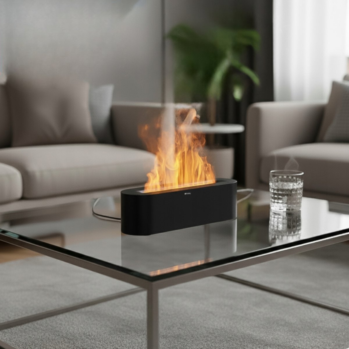 ✨ Poczuj ciepło migoczących płomieni i świeżość nawilżonego powietrza! Ten nowoczesny dyfuzor i nawilżacz 2w1 łączy funkcję aromaterapii, efektu płomienia LED oraz ultradźwiękowej atomizacji.