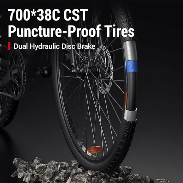 Bezpieczna jazda: Rower elektryczny DYU wyposażony jest w odporne na przebicie opony 700 x 38C CST oraz przednie i tylne podwójne hydrauliczne hamulce tarczowe, co poprawia skuteczność hamowania i znacznie zwiększa bezpieczeństwo. Jasny reflektor przedni i tylny reflektor zapewniają bezpieczeństwo podczas jazdy nocą.