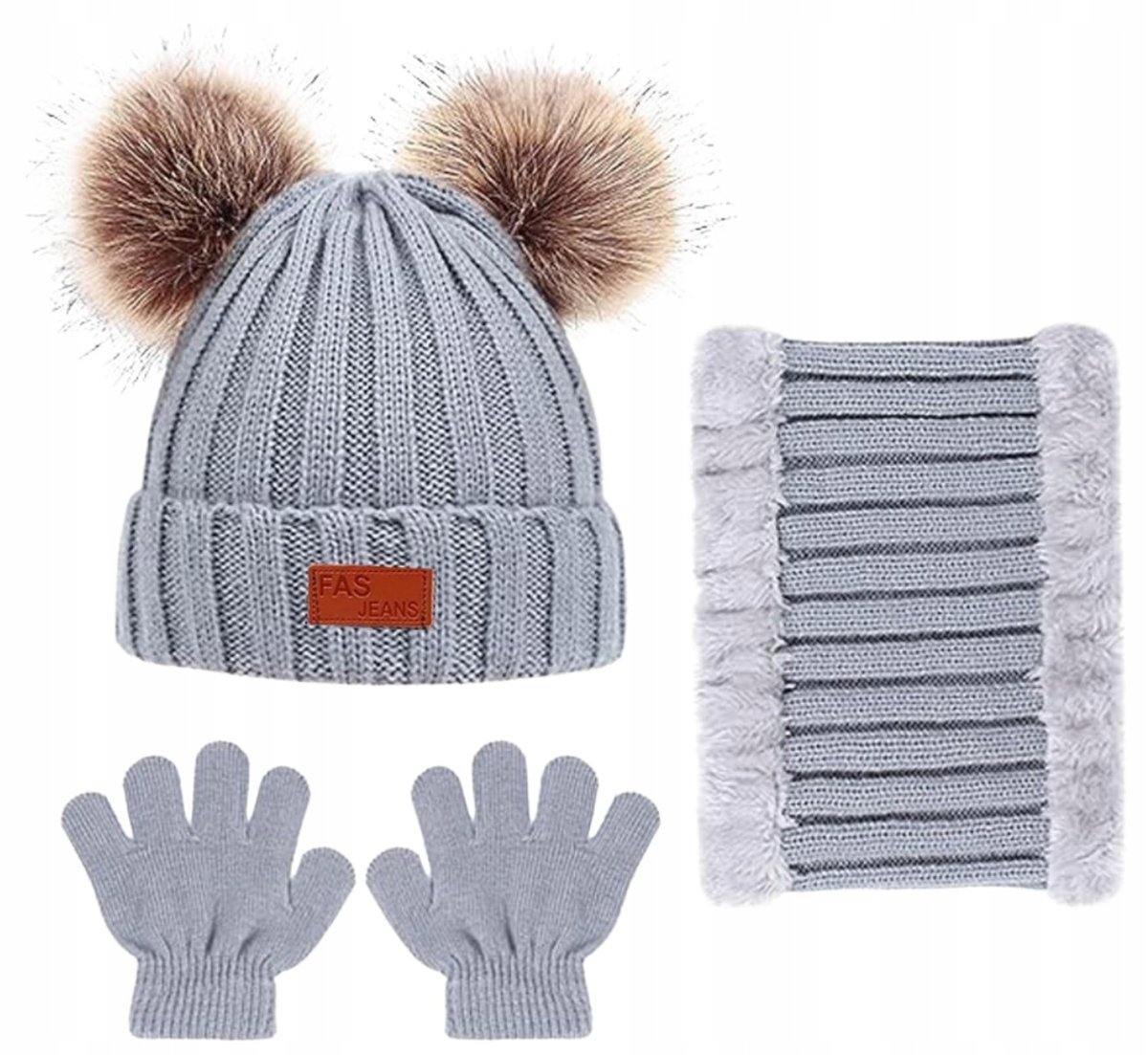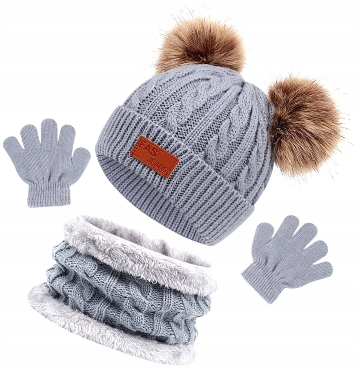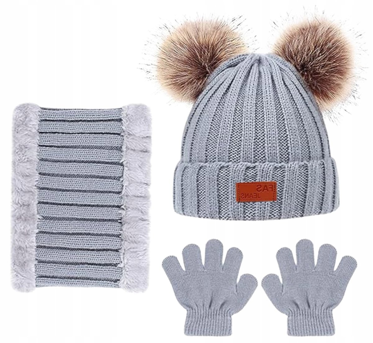 ✅ Zestaw dziecięcy: czapka z dwoma pomponami, komin oraz rękawiczki