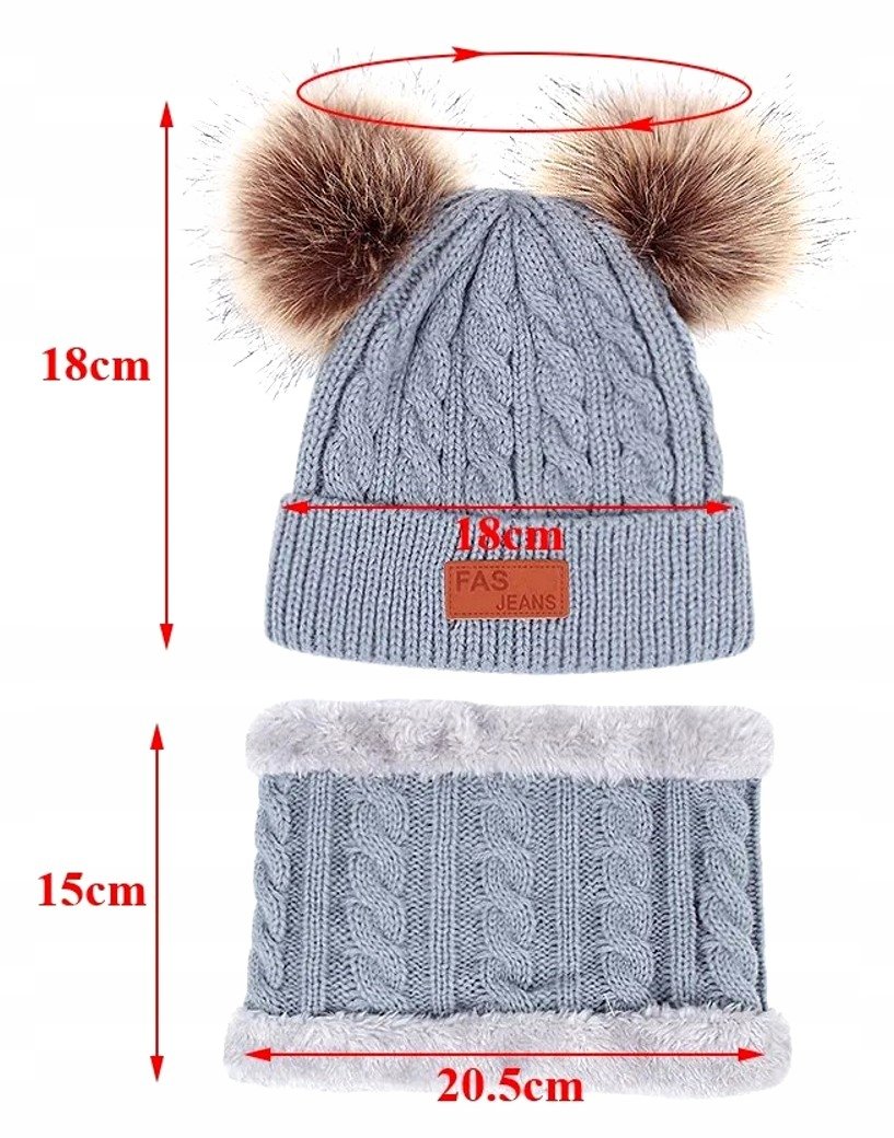 ✅ Wymiary czapki to: wysokość 18 cm i szerokość 18 cm, a kominu: wysokość 15 cm i szerokość 20.5 cm. Rękawiczki mają wysokość 13 cm i szerokość 6 cm.
