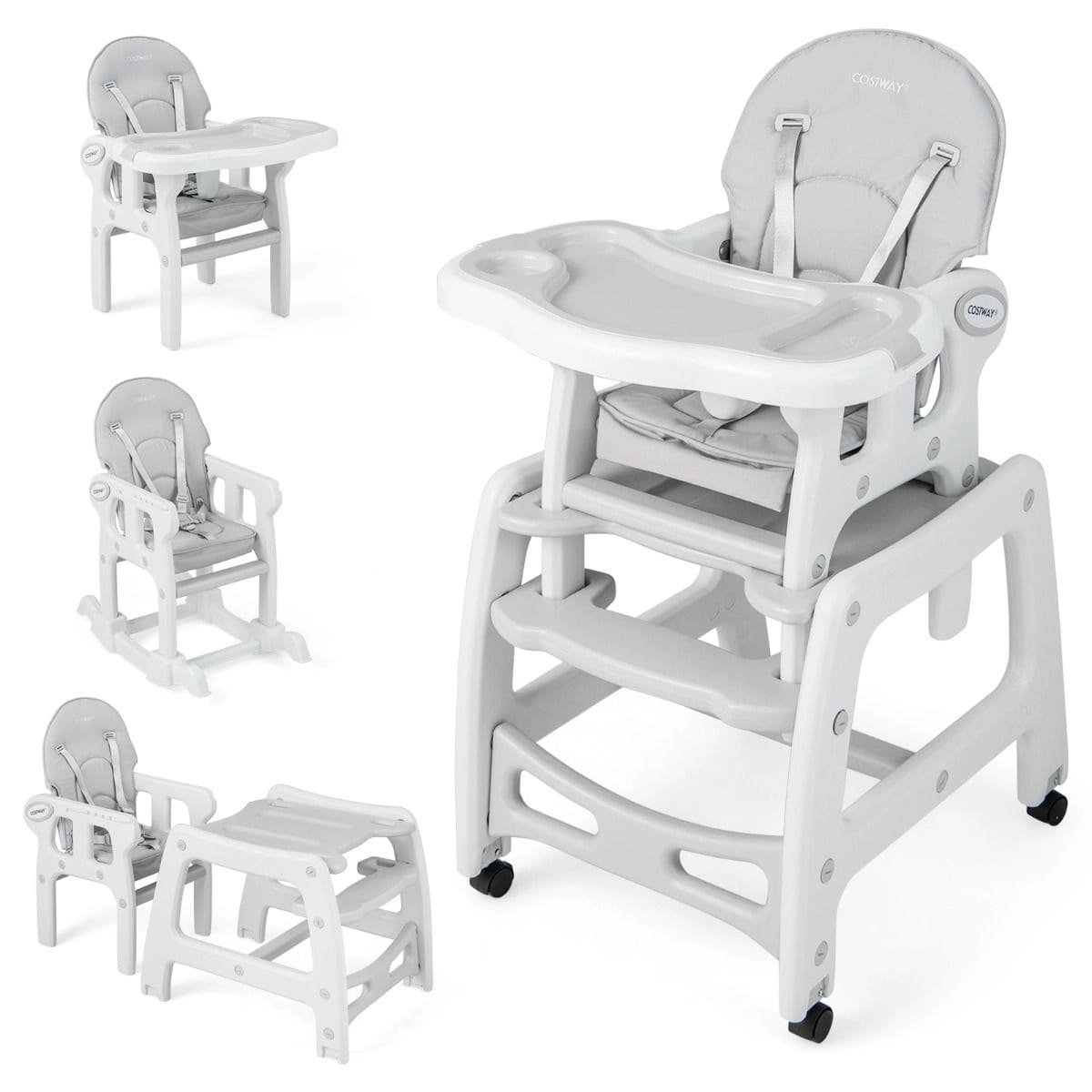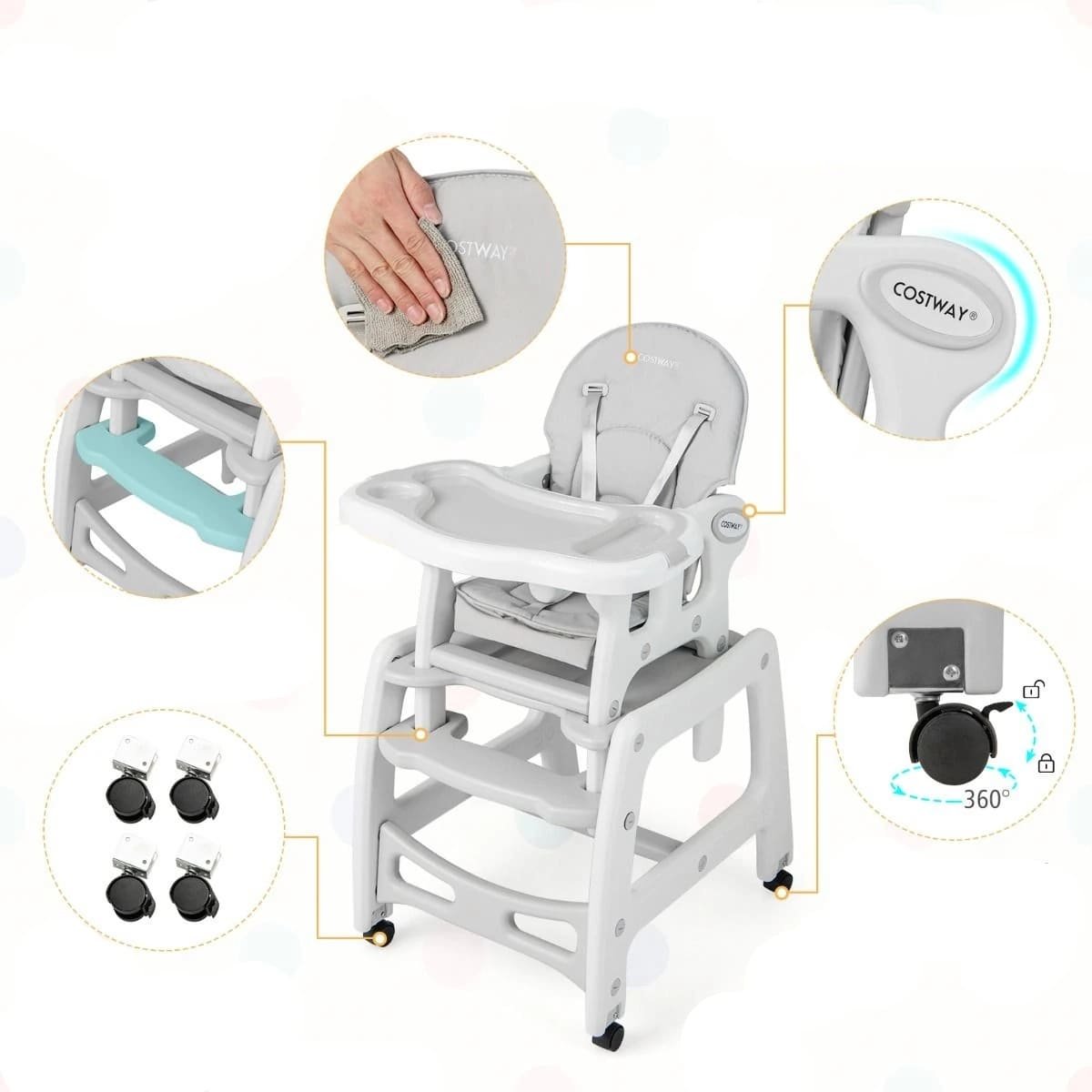 Krzesełko do jedzenia dla małych dzieci to radość z jedzenia i wygoda dla rodziców. Uniwersalna konstrukcja pozwala na używanie elementów lub całości kompletu do różnych aktywności. Można je używać jako krzesełko, stolik lub fotel bujany. Zarówno oparcie, jak i tacka mogą być regulowane w 3 pozycjach dla większego komfortu podczas siedzenia. Górna taca, wyposażona w uchwyty na kubki i sztućce, jest idealna do posiłków i samodzielnego jedzenia. Taca wykonana jest z nieszkodliwego materiału PP. Dzięki 4 uniwersalnym kółkom, to krzesełko dla dzieci jest łatwe do przemieszczania. 3-w-1: Krzesełko można przekształcić w fotel bujany oraz rozdzielić na krzesło i stolik. Dzięki tej wielofunkcyjnej konstrukcji krzesło dostosowuje się do wzrostu dziecka. . Zalecany wiek: 6-36 miesięcy. Wygodne siedzenie: Oparcie posiada 3 regulowane kąty (100°/110°/120°), oferując dziecku wygodną postawę podczas posiłków, zabawy i odpoczynku. Wyposażone jest również w grubą, miękką poduszkę na siedzisko dla dodatkowego komfortu. Zdejmowana podwójna taca: Taca regulowana jest w 4 pozycjach oraz można ją zdjąć w zależności od potrzeb. Wykonany z materiału PP klasy spożywczej, taca jest nietoksyczna i nadaje się do mycia w zmywarce. Stabilna konstrukcja i ochrona bezpieczeństwa: Konstrukcja krzesełka zbudowana jest na wzór piramidy, ma stabilny środek ciężkości i nie jest wywrotne. Wszystkie rogi i krawędzie są zaokrąglone, aby chronić dziecko przed zadrapaniami. 5-punktowy pas bezpieczeństwa dodaje dodatkowego bezpieczeństwa. Łatwy montaż i przemieszczanie: Dostarczane jest ze szczegółową instrukcją i niezbędnymi akcesoriami. 4 uniwersalne kółka sprawiają, że przemieszczanie go nie wymaga wysiłku. Wszystkie kółka są blokowane podczas ustawiania krzesła do pożądanej pozycji. Cechy: Zawiera: