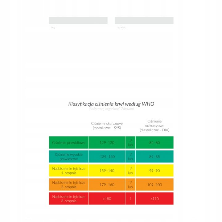 Dzienniczek pomiaru ciśnienia tętniczego Format: A6 Okładka: kreda błysk 250g Druk: dwustronny Oprawa: zeszytowa, 12 stron + okładka