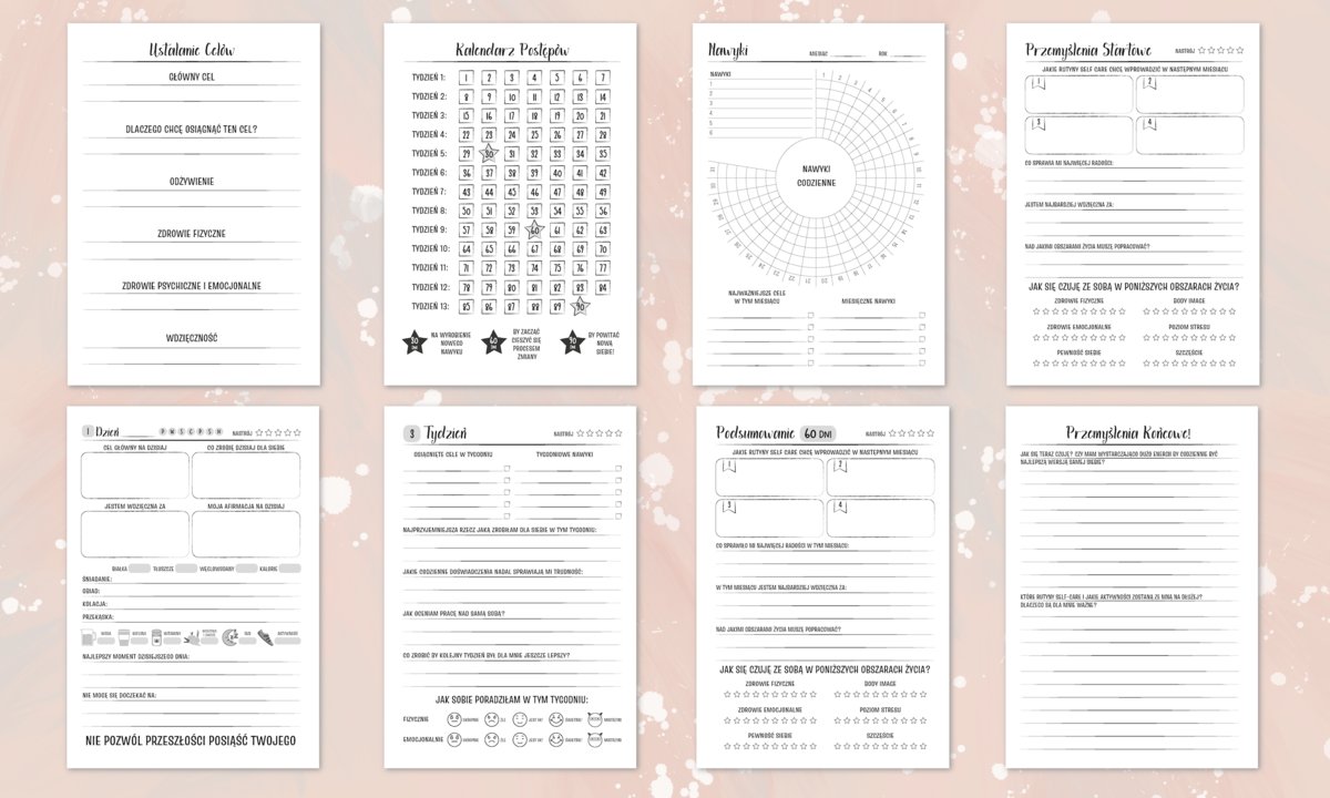 Dodatkowe funkcje to kalendarz postępów na 90 dni (czyli 13 tygodni) oraz kalendarz budowania nawyków na każdy miesiąc, które pomogą Ci utrzymać motywację i systematyczność w działaniu.