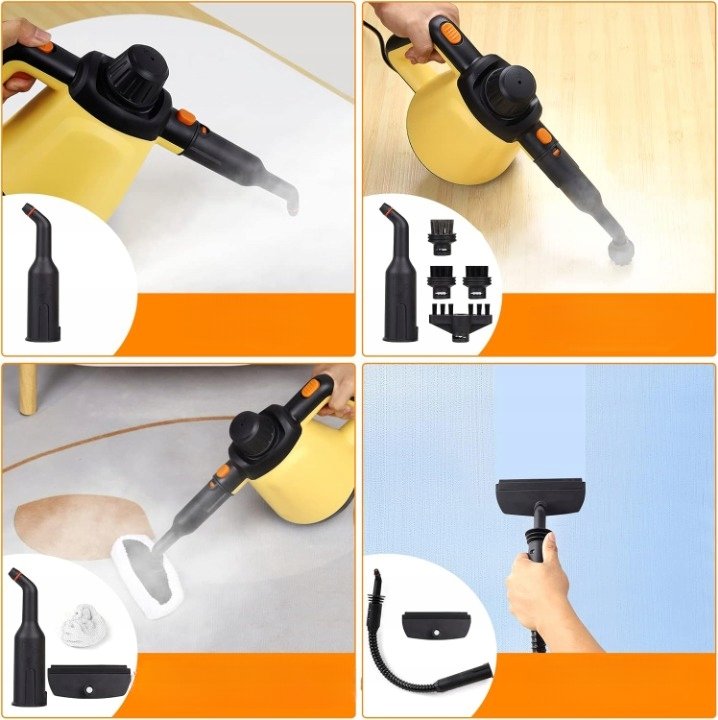 Sprzęt posiada pojemny zbiornik na wodę 350 ml, co umożliwia do 10 minut ciągłej pracy bez potrzeby ponownego uzupełniania. Wyposażony w zestaw akcesoriów czyszczących, w tym szczotki nylonowe i stalowe, końcówki do fug i narożników oraz dyszę do okien, sprawdzi się w kuchni, łazience, samochodzie, a także na tapicerce czy tkaninach.