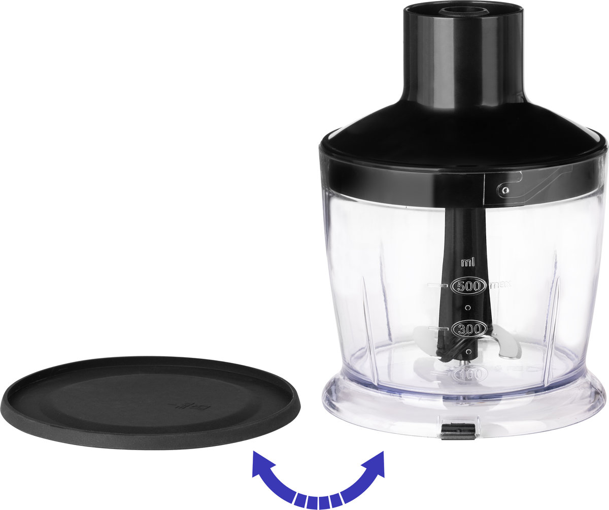 Praktyczne akcesoria zawarte w zestawie (rozdrabniacz do warzyw z pojemnikiem 500 ml, ubijaczka podwójna, trzepaczka druciana, pojemnik 600 ml)