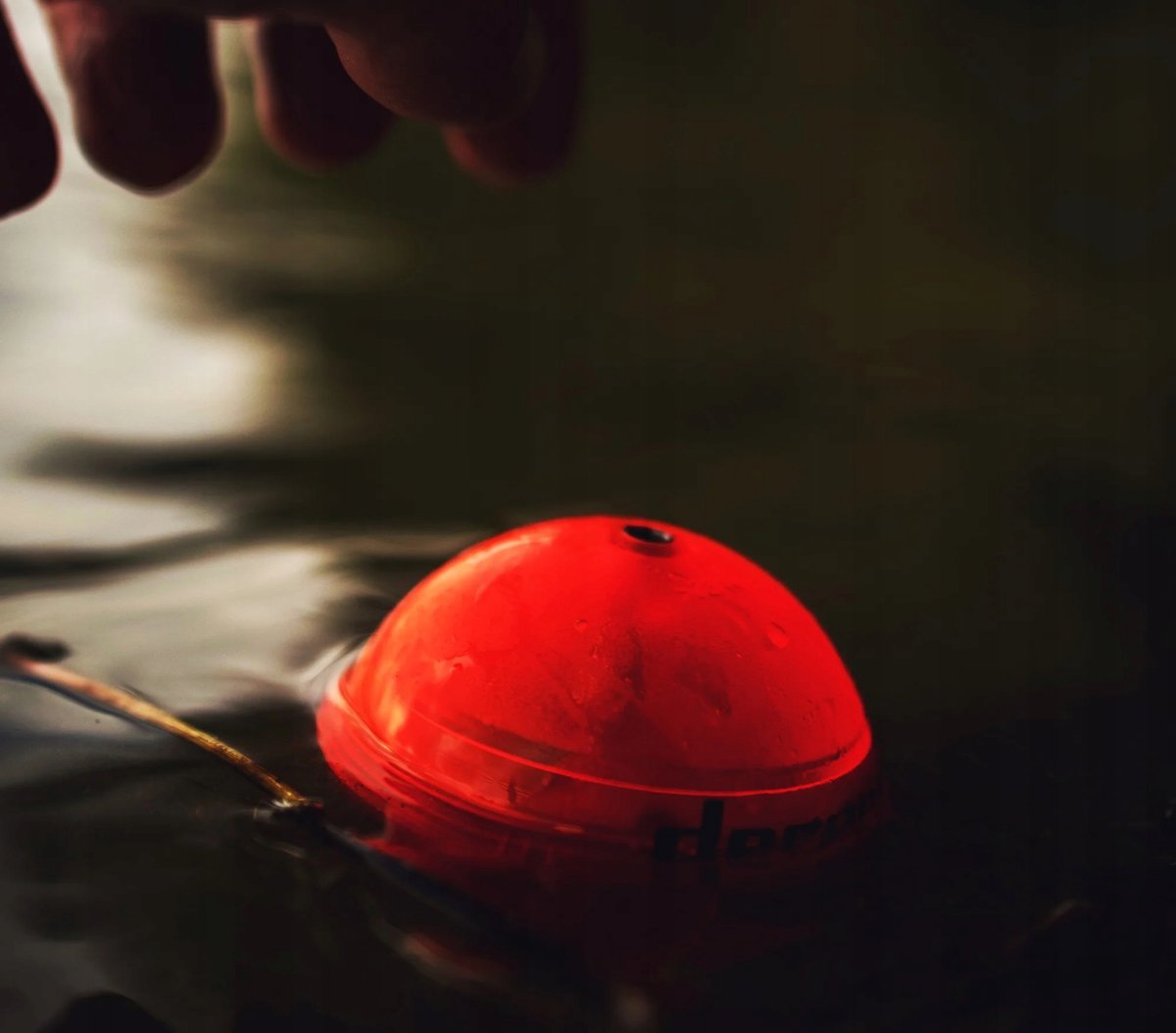 Półprzezroczysta pomarańczowa osłona do wędkowania nocą przepuszcza jasne, migające światło diody LED, dzięki czemu urządzenie jest wyraźnie widoczne nocą z dużej odległości.