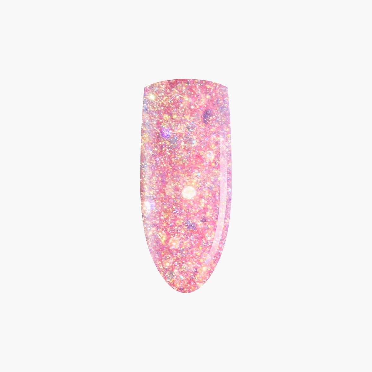 To semitransparentny różowy lakier hybrydowy o fenomenalnym efekcie opalizującym na brzoskwiniowo-złoty kolor, z niesamowitymi wielowymiarowymi drobinami. Manicure wykonany tym kolorem przyciąga uwagę i zaczarowuje zmysły.