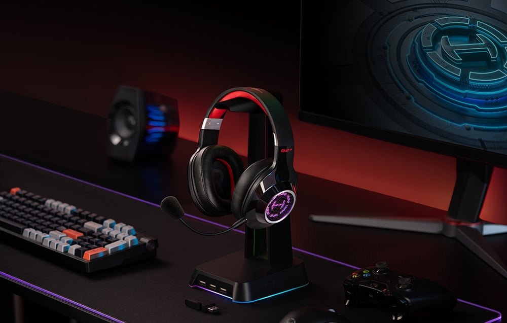 Wygoda to podstawa. G2 S ważą 252 g, a elastyczny pałąk z polipropylenu dopasowuje się do kształtu głowy. Miękkie nauszniki z ekoskóry szczelnie izolują dźwięk, a jednocześnie nie powodują ucisku – także u osób noszących okulary. Powierzchnia jest odporna na zarysowania, więc słuchawki zachowują świeży wygląd po wielu podróżach w plecaku. Do tego dochodzi intuicyjne sterowanie – wszystko pod ręką: głośność, wyciszenie, tryby dźwięku, RGB i wybór źródła. Zakładasz i grasz – tyle.