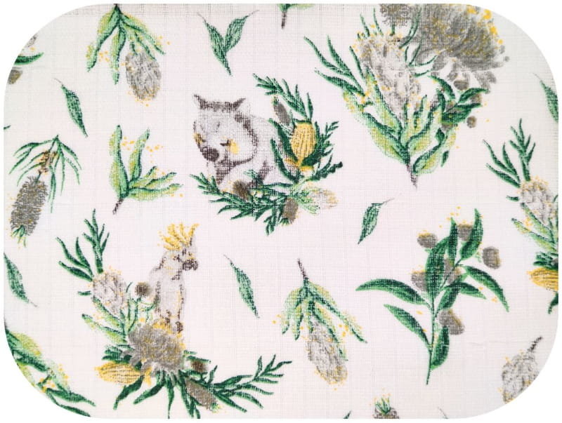 Tetrowa pieluszka posiada print wykonany w przyjemnych dla oka kolorach, przedstawiający koale.