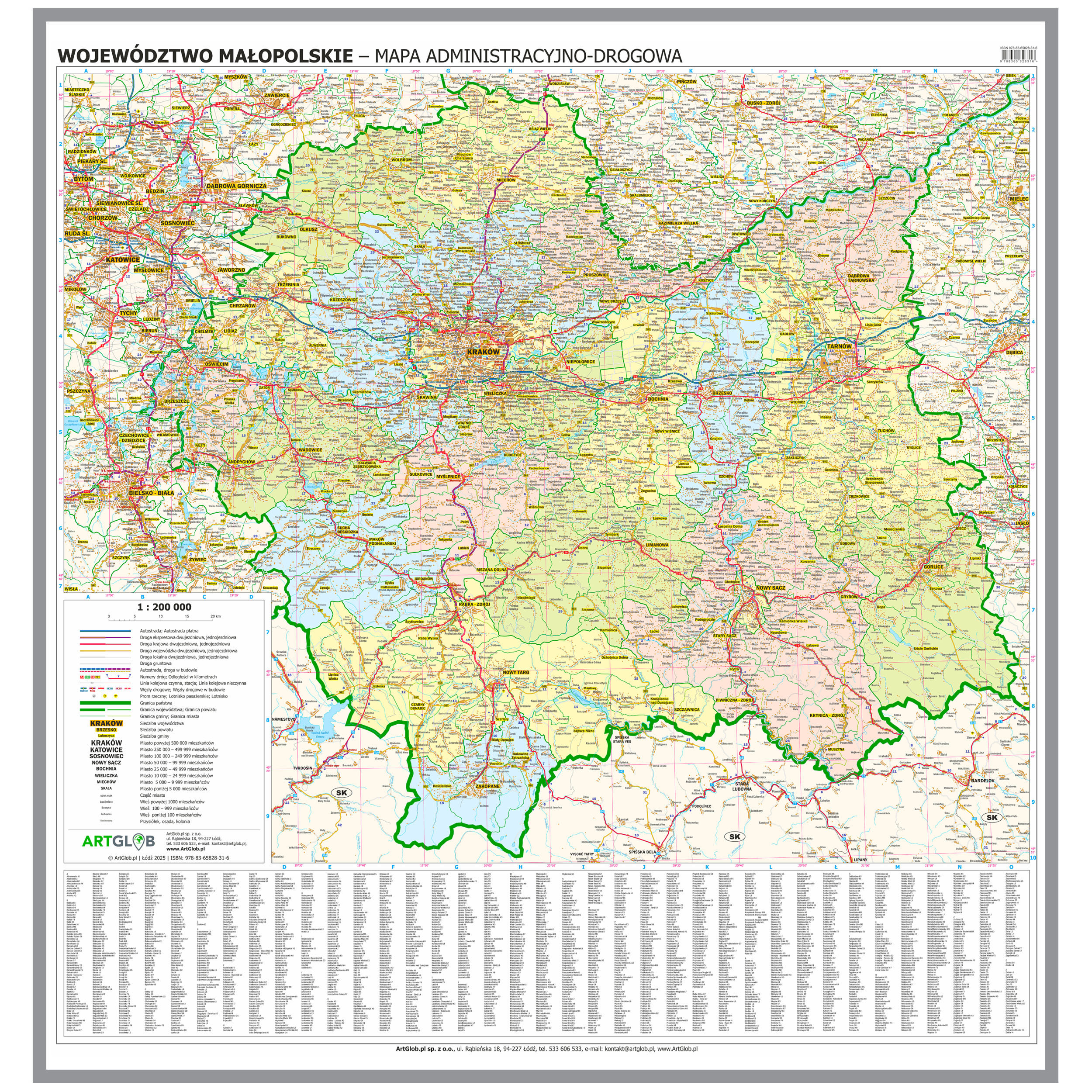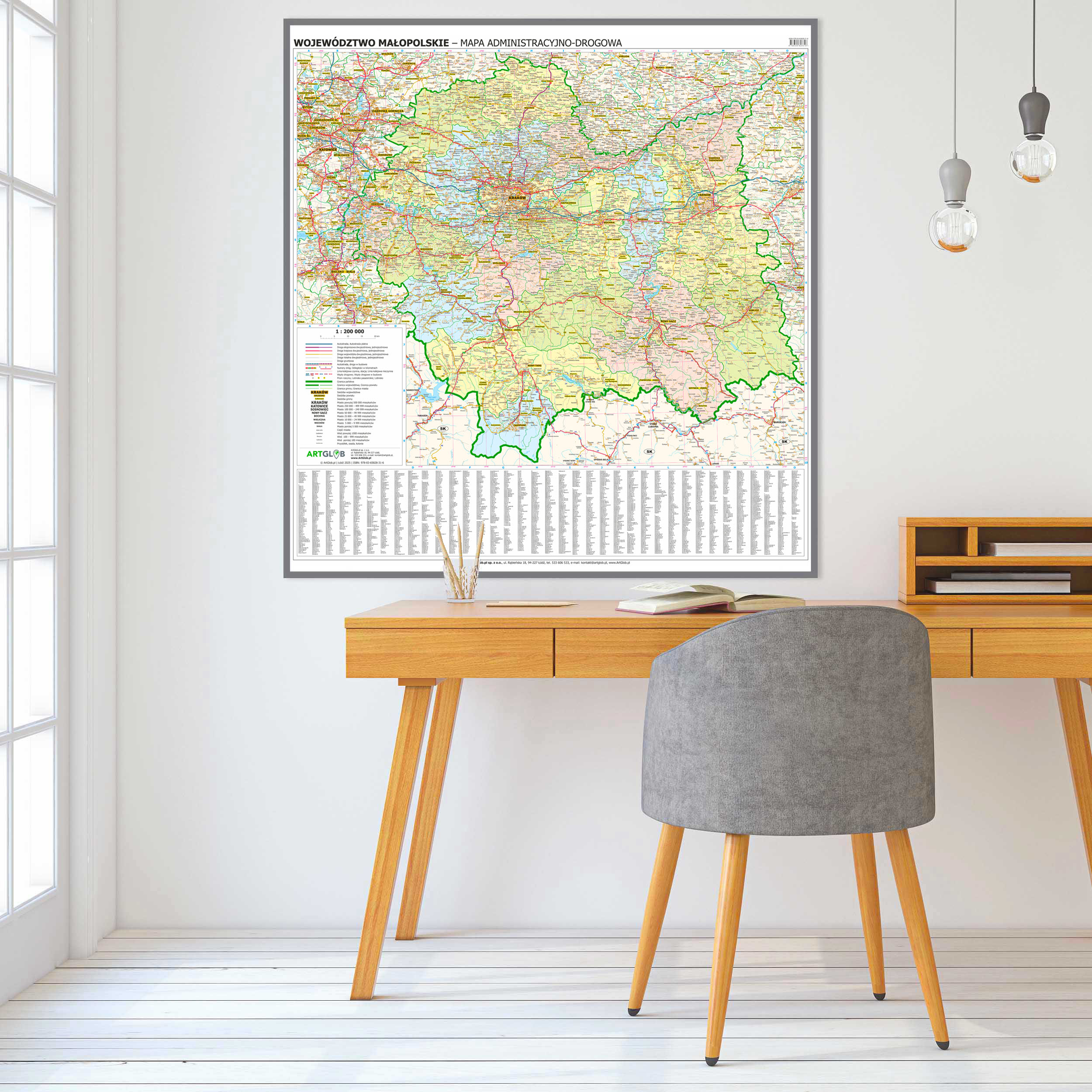 Ścienna mapa administracyjno-drogowa województwa małopolskiego. Treść topograficzna mapy obejmuje bogatą sieć dróg i autostrad oraz szczegółowy podział administracyjny. Ponadto zamieszczono sieć hydrograficzną i linie kolejowe. Mapę uzupełniają lotniska, promy i przejścia graniczne, kilometraż na drogach oraz szczegółowy skorowidz miejscowości. Przyjazna kolorystyka, czytelna grafika oraz bogata treść sprawia, że mapa ta idealnie nadaje się do urzędów, biur i spedycji. Sprawdzi się również jako wystrój innego pomieszczenia.