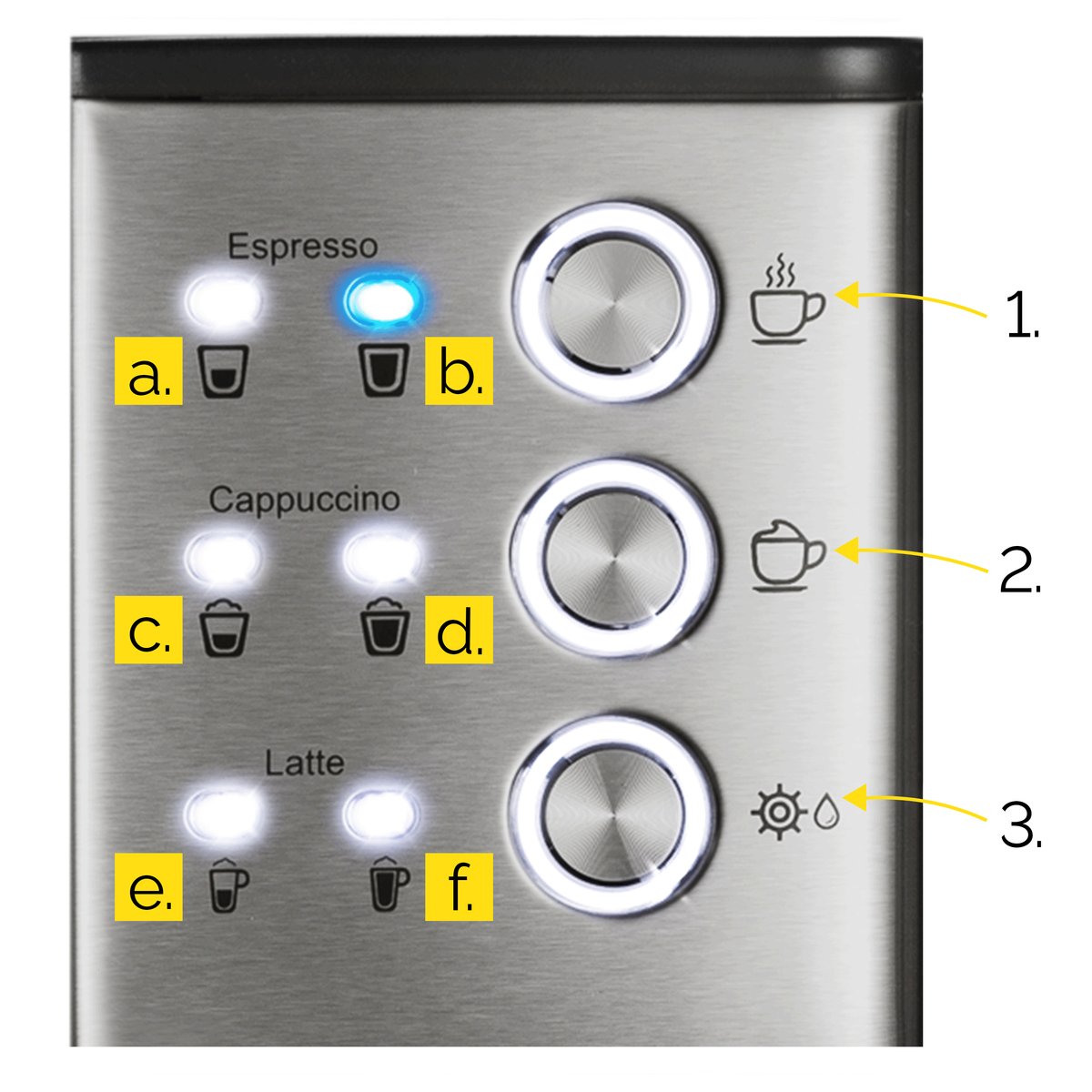 - Suwak regulacji dyszy spieniacza na mleko - dostosuj położenie dyszy spieniacza do wysokości filiżanki, aby uniknąć rozlania mleka.