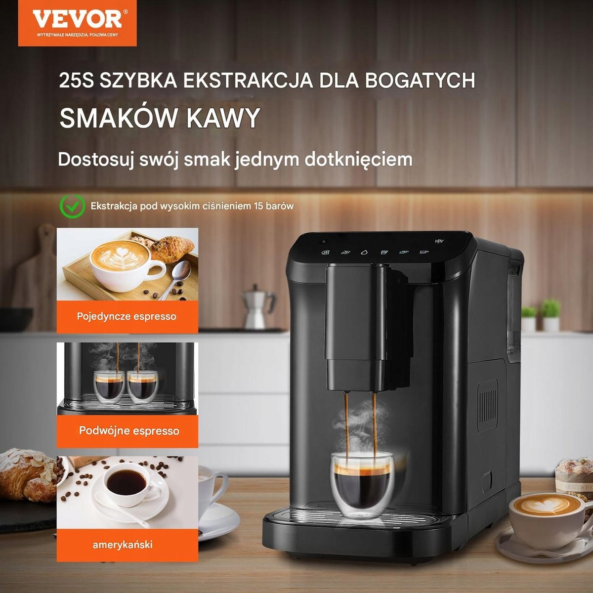 Ekstrakcja pod wysokim ciśnieniem 15 barów: pojedyncze espresso, podwójne espresso, amerykański.