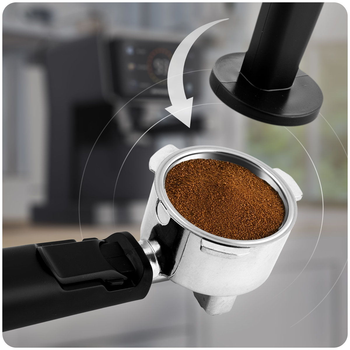 Dzięki niemu łatwo nasypiesz odpowiednią ilość kawy do kolby, a następnie dociśniesz ją równomiernie, co jest kluczowe dla uzyskania pełnego aromatu i bogatego smaku espresso.