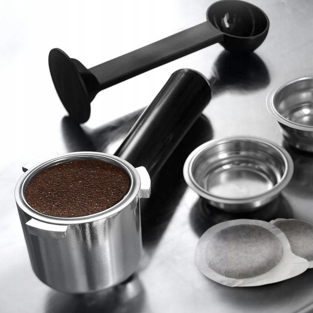 Metalowy korpus z chromowanym wykończeniem oraz profesjonalna kolba pozwalają się czuć jak prawdziwy barista. Zabezpiecznie przed kapaniem zapewnia, że kawa nie znajdzie się tam, gdzie nie powinna.