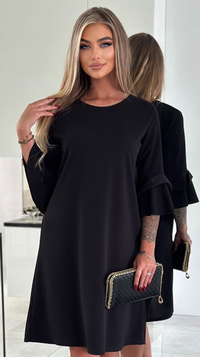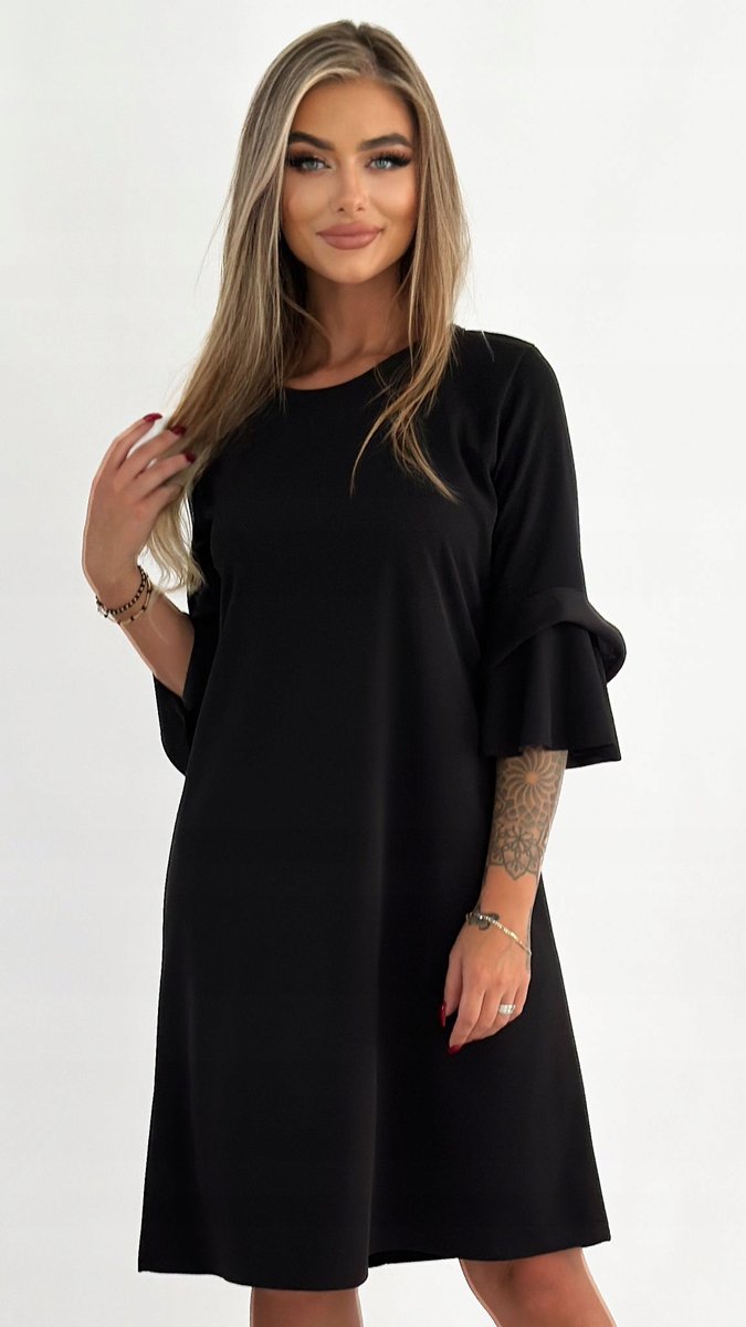 Właśnie zrecenzowałem Elegancka Czarna Sukienka Falbanki Midi 3/4 Rękaw Wizytowa Rozmiar 38
