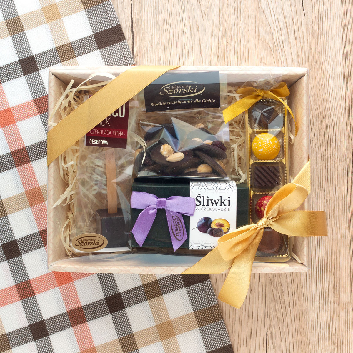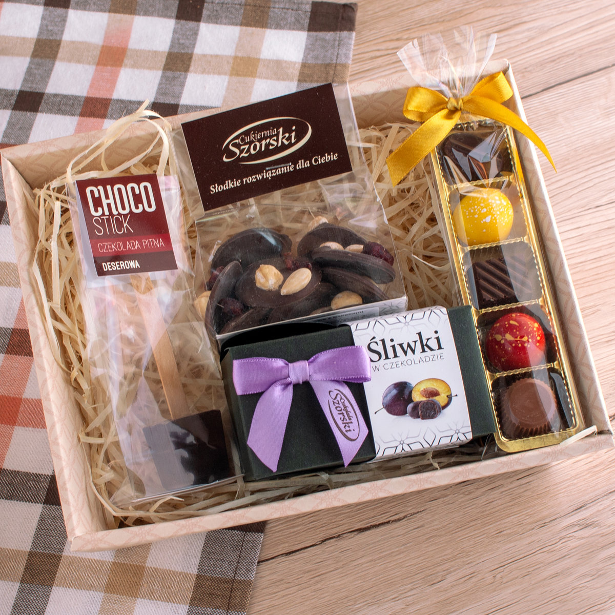 Koszyk prezentowy to dokonały pomysł na prezent dla niej i dla niego. Zestaw czekoladowych produktów deluxe sprosta oczekiwaniom nawet najbardziej wymagających koneserów słodkości. W skład zestawu prezentowego wchodzą najwyższej jakości czekoladki deserowe pełna aromatycznych owoców i orzechów, słodkie, suszone chilijskie śliwki oblane cienką warstwą wyśmienitej czekolady deserowej, luksusowe, ręcznie robione praliny oraz choco stick czyli wyśmienita belgijska czekolada do picia. Ten elegancki zestaw upominkowy będzie wspaniałym pomysłem na prezent dla mamy, taty, nauczyciela, a także pracownika, klienta lub partnera biznesowego.