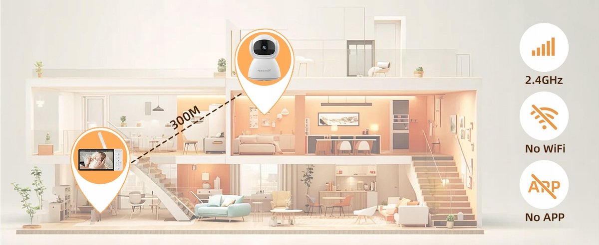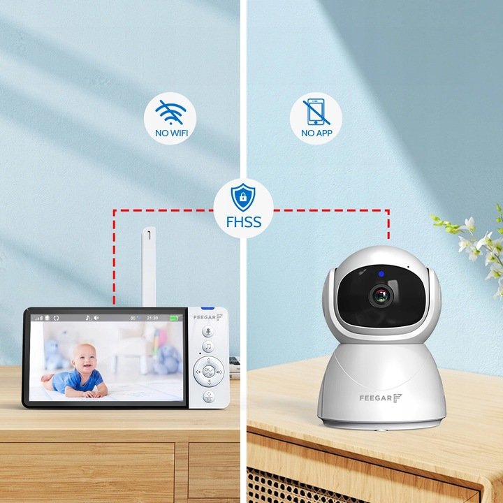 Bez Wifi, Bez aplikacji! Elektroniczna niania Feegar z kamerą wykorzystuje niezawodną technologię bezprzewodową FHSS 2,4 GHz oraz cyfrowe szyfrowanie, aby zapewnić monitorowanie obrazu i dźwięku w czasie rzeczywistym oraz 100% prywatności i bezpieczeństwa.