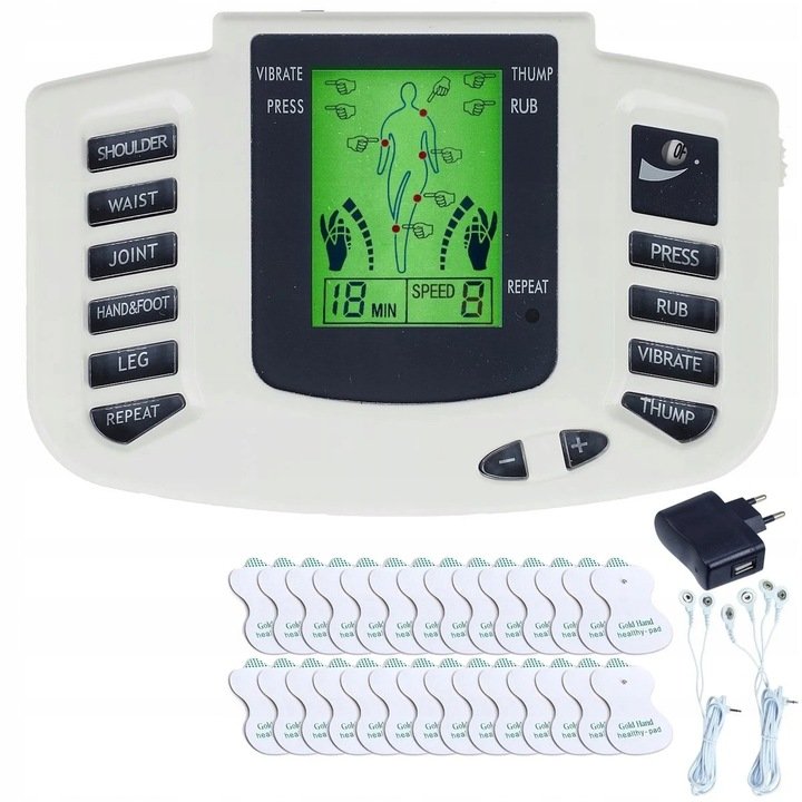 Elektrostymulator TENS/EMS z 16 elektrodami na ciałoElektrostymulator to urządzenie do terapii przeciwbólowej i wzmacniającej garnitur mięśniowy do użytku domowego. Pomaga w codziennych problemach ...