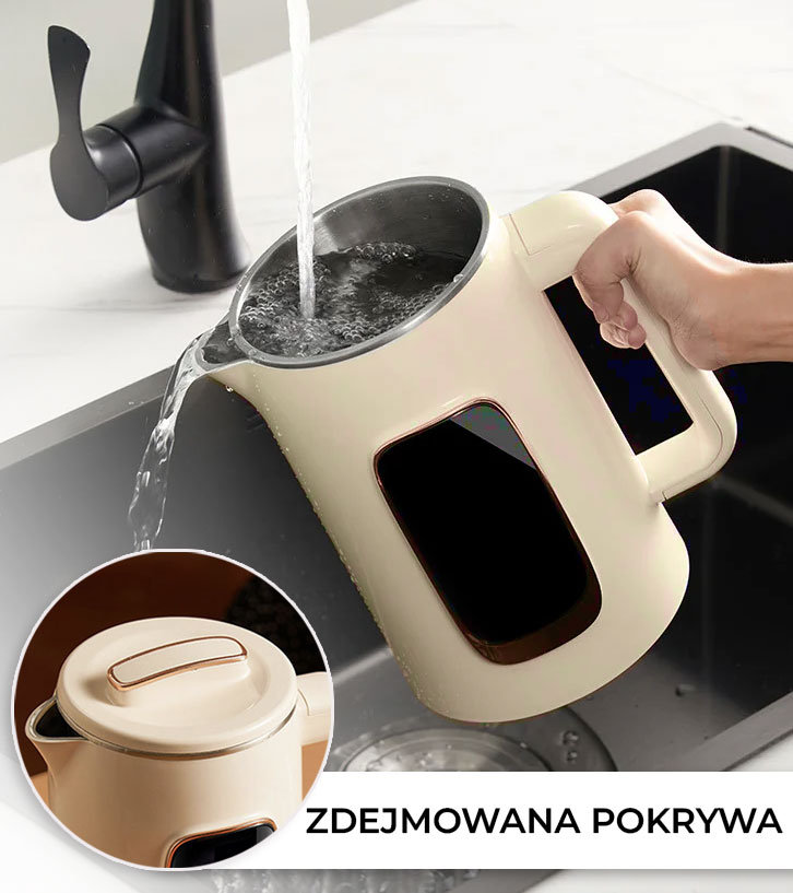 Dzięki zdejmowanej pokrywie możesz szybko i skutecznie usunąć kamień oraz inne zanieczyszczenia, co przyczynia się do zachowania idealnej czystości i dłuższej sprawności czajnika.