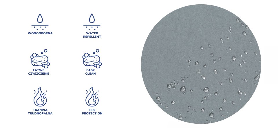 Water Repellent - Tkanina Velvet pokryta jest specjalną warstwą ochronną, tworzącą hydrofobową powłokę zabezpieczającą przed szybkim przesiąkaniem płynów. Zapobiega to natychmiastowemu absorbowaniu wody przez tkaninę, sprawiając że ciecz skrapla się na powierzchni materiału.