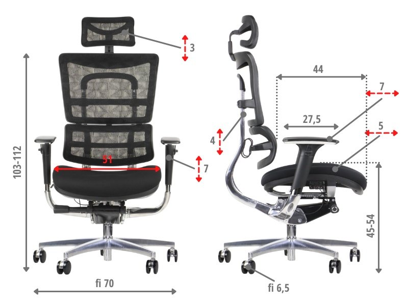 SPECYFIKACJA stelaż i łącznik oparcia z siedziskiem wykonany z aluminiowego odlewu regulacja wysokości, odchyłu i wysuwu realizowana za pomocą przycisków przy siedzisku regulowany zagłówek 3D ...