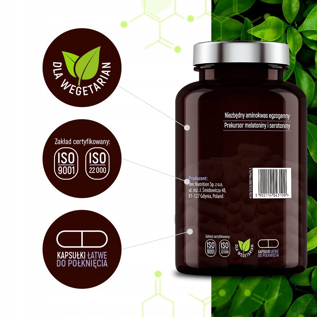 Składniki: 78 % L-tryptofan, otoczka kapsułki [substancja glazurująca – hydroksypropylometyloceluloza)], substancja przeciwzbrylająca (sole magnezowe kwasów tłuszczowych).