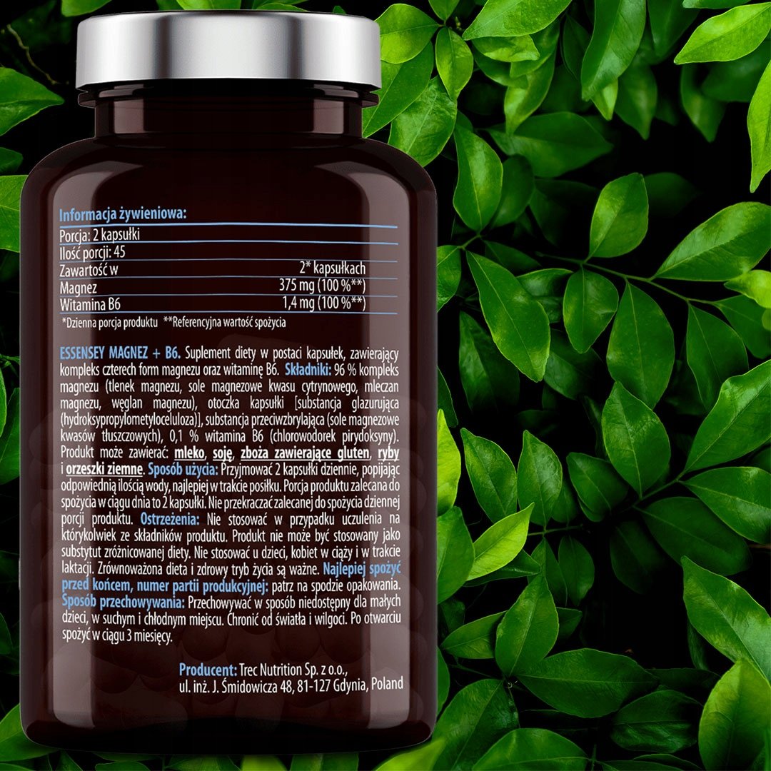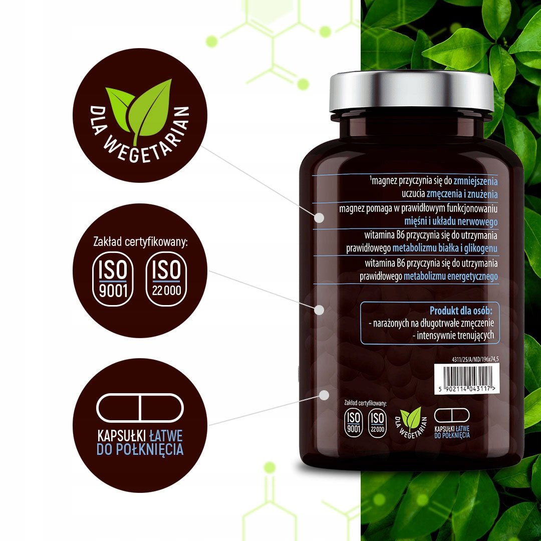 Składniki: 96 % kompleks magnezu (tlenek magnezu, sole magnezowe kwasu cytrynowego, mleczan magnezu, węglan magnezu), otoczka kapsułki [substancja glazurująca (hydroksypropylometyloceluloza)], substancja przeciwzbrylająca (sole magnezowe kwasów tłuszczowych), 0,1 % witamina B6 (chlorowodorek pirydoksyny).