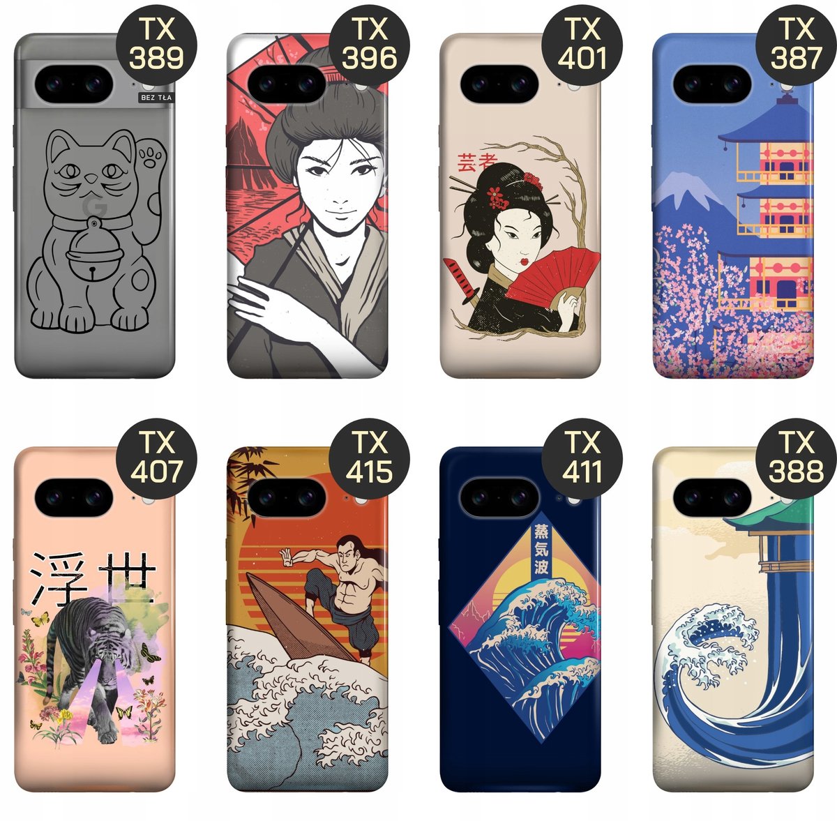 Set Japonia to zbiór grafik, które nawiązują do japońskiej kultury, sztuki i przyrody. Znajdziesz tutaj motyw Wielkiej Fali, autorstwa Hokusaia, górę Fudżi, gejsze czy koty, które zajmują kluczowe miejsce w tradycji japońskiej. Znajdź grafikę, które najbardziej Ci odpowiada, a my wydrukujemy ją na etui Twojego telefonu.