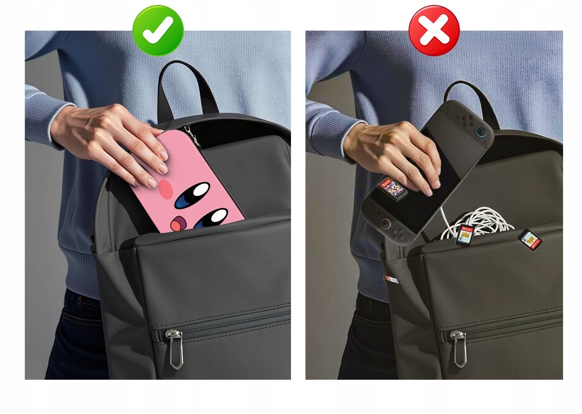 Etui doskonale współgra z innymi gadżetami ze świata Kirby – świetnie prezentuje się obok figurek Amiibo, edycji kolekcjonerskich, limitowanych wersji konsol oraz pudełek z grami. Dzięki starannemu wykonaniu i stylowemu designowi, podkreśla Twoje zaangażowanie w świat ulubionej serii i dodaje charakteru całemu zestawowi.
