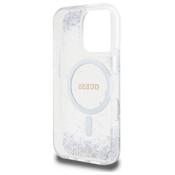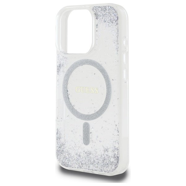W centralnej części etui znajduje się logo Guess oraz brokatowy pierścień MagSafe, które subtelnie podkreślają prestiż tego etui.