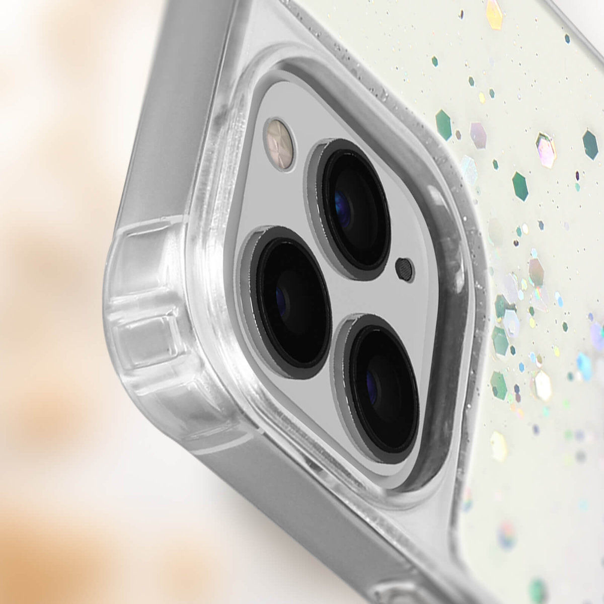 Brokatowe etui do iPhone'a 11 Pro. Odpinany pleciony nylonowy pasek, funkcja paska na szyję lub na ramię. Pewny chwyt. Silikonowe etui ze wzmocnionymi rogami. Podniesiony ekran i kontury aparatu. Dostępne funkcje.