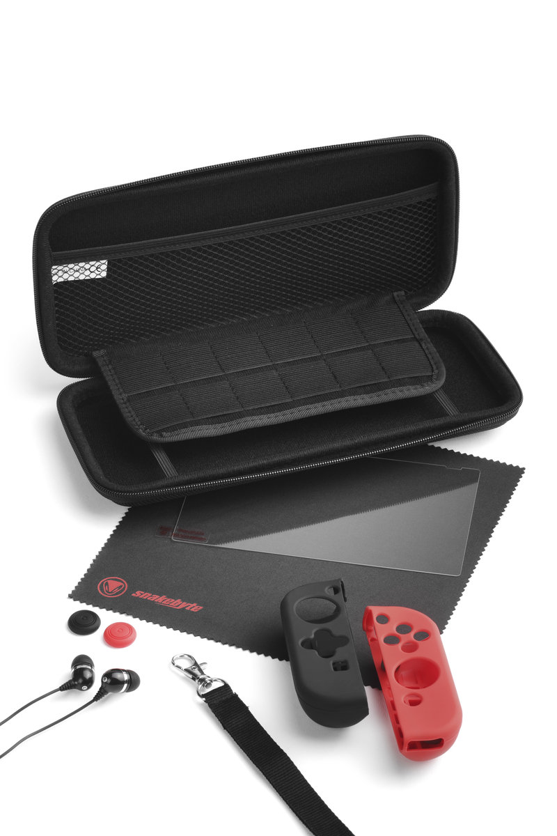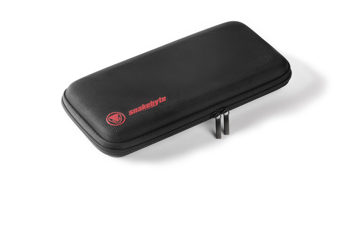 Tutaj znajdziesz wszystkie niezbędne akcesoria do podróży w jednym zestawie snakebyte STARTER KIT PRO zawiera wysokiej jakości etui ze zintegrowaną wewnątrz klapką ochronną na 12 kartridży do gier, ultra twardą szybę ochronną ekranu, silikonowe uchwyty kontrolera Joy-Cons, słuchawki douszne, nakładki na przyciski kontrolera i ściereczkę do czyszczenia zabrudzeń ekranu.