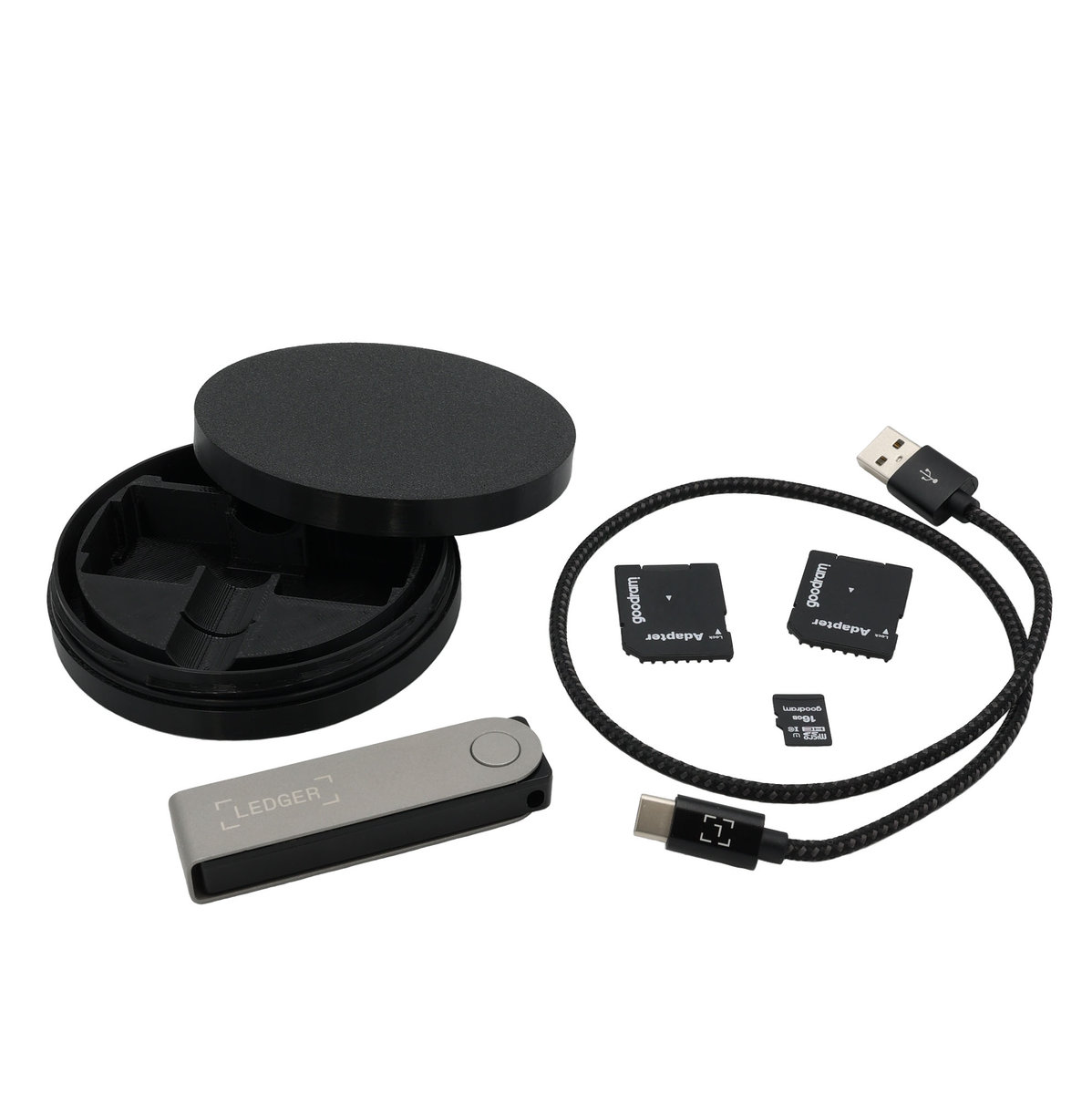 Etui / case na Ledger oraz kabel zasilający to schowek, w którym możesz umieścić dwie karty SD oraz jedną kartę micro SD. Dzięki temu możesz przechowywać dodatkowe dane, kopie zapasowe lub inne ważne informacje w jednym miejscu.