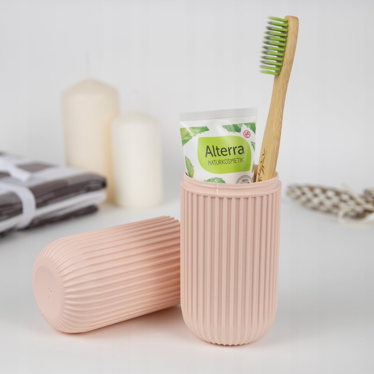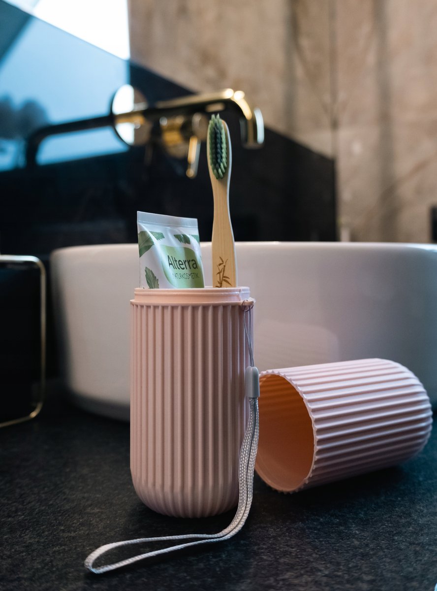 Poza funkcją ochronną przyborów higienicznych, część nakrywki pełni także rolę kubka do płukania jamy ustnej po umyciu zębów.