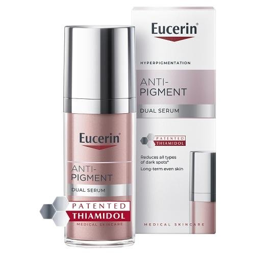 Eucerin Anti-Pigment Dual Serum to zaawansowany dermokosmetyk opracowany z myślą o skutecznej walce z przebarwieniami skóry. Innowacyjna, dwukomorowa formuła łączy dwa silnie działające składniki aktywne: Thiamidol® – opatentowany przez Eucerin składnik, który redukuje przebarwienia u źródła ich powstawania, oraz skoncentrowany kwas hialuronowy, który intensywnie nawilża skórę i wygładza drobne linie.