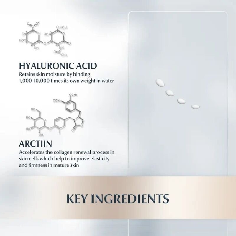 Jego unikalna formuła łączy moc kwasu hialuronowego o różnej wielkości cząsteczek z arctiiną, która przyspiesza odbudowę kolagenu, dzięki czemu Twoja skóra wokół oczu staje się wyraźnie gładsza i bardziej elastyczna.