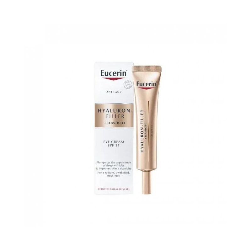 Eucerin hyaluron-filler + elasticity eye spf 15 to krem przeciwzmarszczkowy pod oczy, który wypełnia głębokie zmarszczki i poprawia elastyczność skóry.