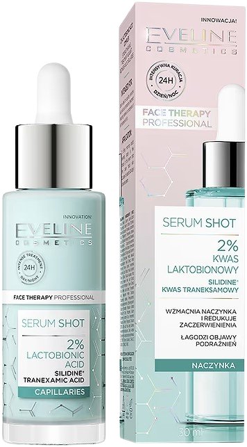Eveline Serum Shot Kwas Laktobionowy Naczynka30 mlZalety:✅ Wzmacnia naczynka krwionośne i wyrównuje koloryt skóry,✅ Intensywnie regeneruje i wzmacnia skórę, dzięki kwasowi laktobionowemu 2%,✅ Łagodzi
