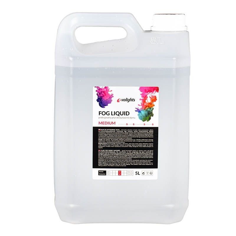EVOLIGHTS FOG LIQUID MEDIUM – profesjonalny płyn do wytwornic dymu (płyn do wytwornic mgły) powstały na bazie oczyszczonej wody i glikolu, przeznaczony do tworzenia scenicznych efektów specjalnych. Roztwór jest bezzapachowy, bezbarwny i nietoksyczny, a co za tym idzie bezpieczny w użyciu. Charakteryzuje się dużą wydajnością i doskonałym efektem zamglenia. Emitowana para jest dość gęsta i stosunkowo długo się utrzymuje, wyraźnie uwidaczniając promienie świateł reflektorów scenicznych. Płyn Evolights typu MEDIUM doskonale sprawdza się jako materiał eksploatacyjny dla różnego typu dymiarek i fazerów. Może być używany w technice estradowej, podczas koncertów klubowych, w dyskotekach i pubach, a także na salach weselnych i różnego typu eventach.