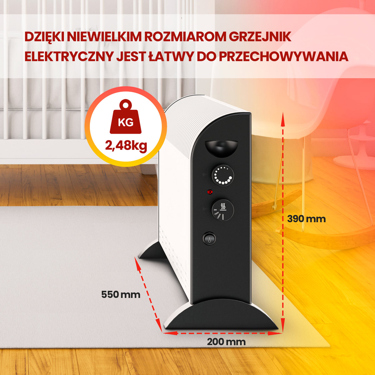 Dzięki zintegrowanym uchwytom grzejnik można łatwo przenosić z pokoju do pokoju, a w połączeniu z jego bezgłośnością jest on elastyczny i idealnie nadaje się do ogrzewania sypialni. Ten konwektor ma kilka dodatkowych funkcji, takich jak ochrona przed przegrzaniem, 3 różne tryby ogrzewania i tryb turbo. Wszystkie te cechy ułatwiają ogrzanie dowolnego pomieszczenia do idealnej temperatury.