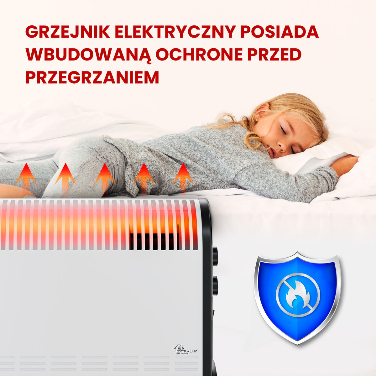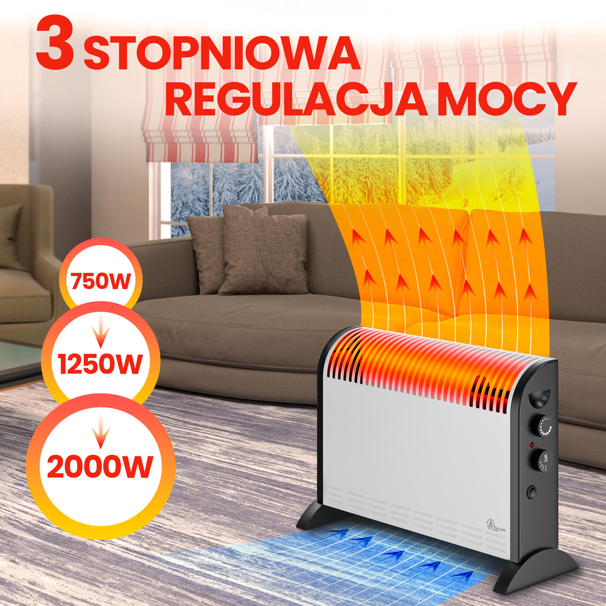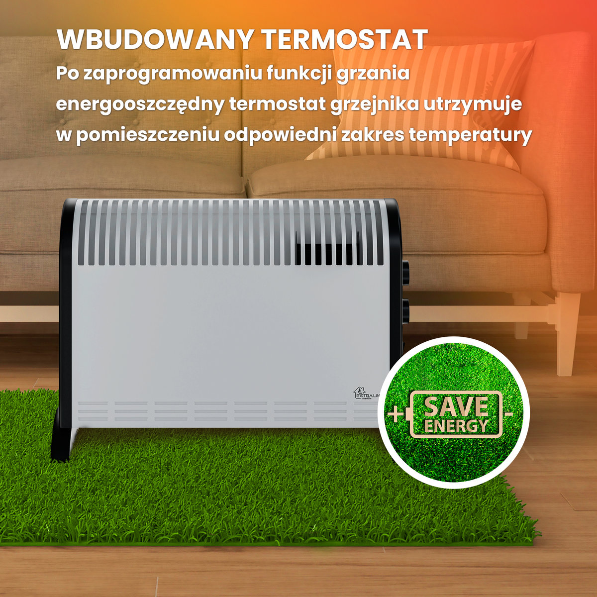 Grzejnik konwektorowy Extralink o maksymalnej mocy grzewczej 2000 W to idealny grzejnik, jeśli chcesz szybko ogrzać pomieszczenie. Użyj tego grzejnika jako awaryjnego zamiennika, gdy system centralnego ogrzewania nie działa lub jako grzejnik w okresie między gorącymi i zimnymi porami roku lub po prostu używaj go w pomieszczeniach, które nie mają centralnego ogrzewania.
