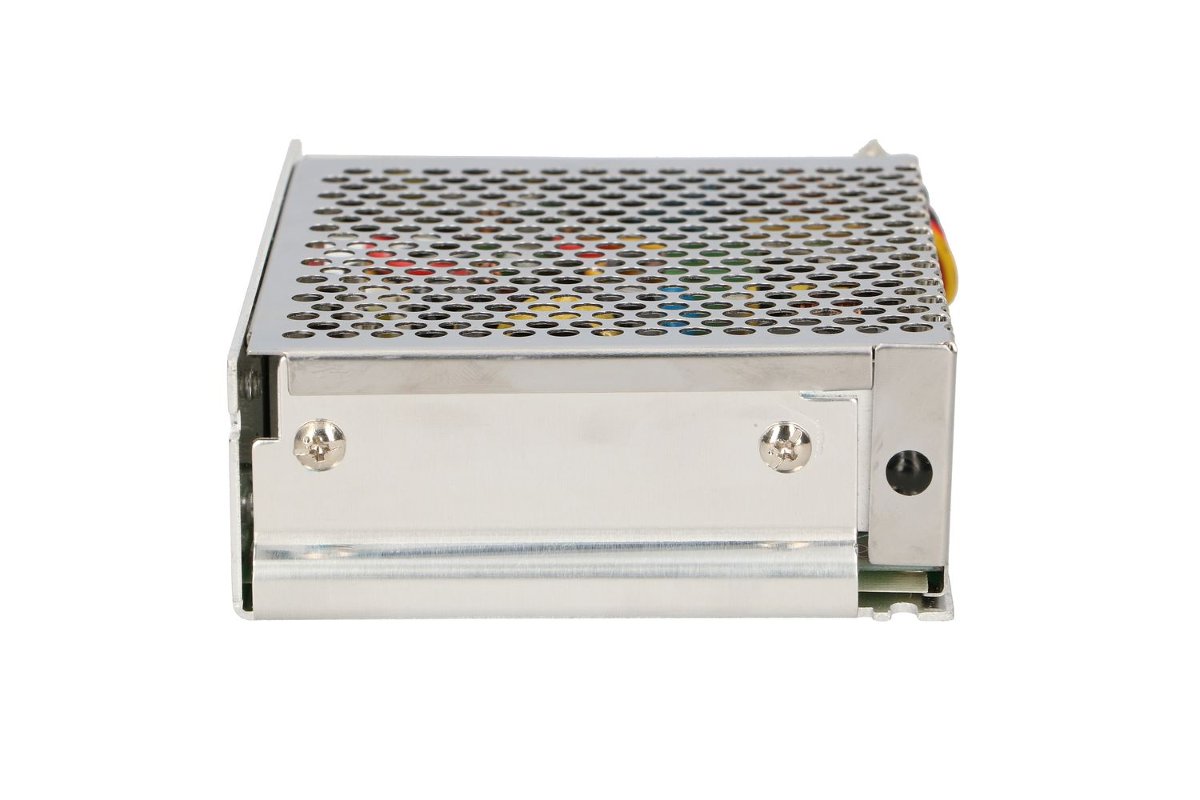 Perforowana obudowa metalowa ułatwia przepływ powietrza, co zwiększa efektywność chłodzenia urządzenia. Zaciski śrubowe są odpowiednio oznaczone i służą do podłączenia wyprowadzeń kablowych zgodnie z zasadami elektryki. Instalator może dostosować napięcie wyjściowe w pewnym zakresie za pomocą potencjometru.