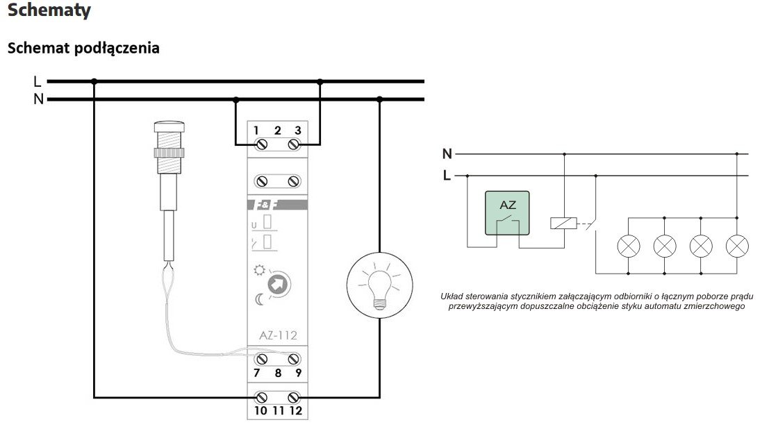 Zmierzchowy włącznik AZ-112 należy umieścić w miejscu o stałym dostępie naturalnego światła dziennego. Zmiany jego intensywności (pora dnia) będą powodowały załączanie i wyłączanie oświetlenia. Czas załączenia oświetlenia może być ustawiony przez użytkownika potencjometrem. Obrót w stronę “księżyca“ - załączy później, obrót w stronę “słoneczka“ - załączy wcześniej. Zmierzchowy włącznik AZ-112 posiada układ opóźniający załączenie i wyłączenie oświetlenia, niwelując w ten sposób wpływ zakłóceń (np. wyładowań atmosferycznych) na pracę automatu.