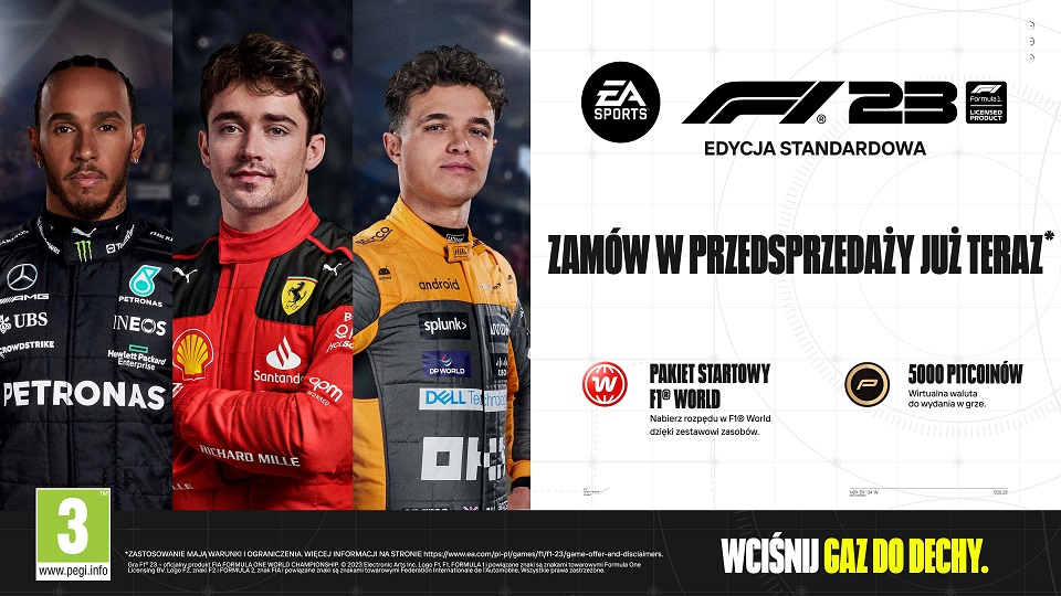 Wciśnij gaz do dechy w EA SPORTS™ F1® 23, oficjalnej grze wideo 2023 FIA Formula One World Championship™. Nowy rozdział w emocjonującym trybie fabularnym „Droga do sławy” to dramatyczna historia i zaciekła rywalizacja. Ścigaj się koło w koło na nowych torach w Las Vegas i Katarze oraz zdobywaj nagrody i modyfikacje w F1® World. Nowym autentycznym elementem strategicznym są czerwone flagi, a wyścigi na 35% dystansu zapewniają więcej akcji i wrażeń. Ciesz się zaktualizowanymi bolidami z 2023 roku, z oficjalnym składem F1® obejmującym Twoich 20 ulubionych kierowców i 10 zespołów. Stwórz swój zespół marzeń w trybie kariery „Mój zespół”, rywalizuj na podzielonym ekranie lub w poszerzonym wieloplatformowym trybie wieloosobowym i udzielaj się w społeczności dzięki nowym ligom Racenet.