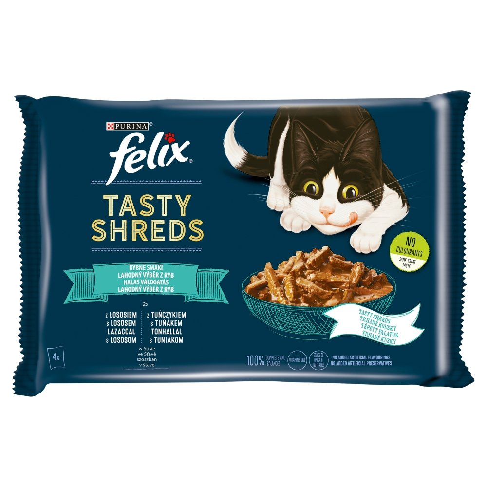 Felix Tasty Shreds 4x80g rybne smaki w sosie łosoś tuńczyk to wspaniały posiłek podany w postaci wygodnych w użyciu saszetek. FELIX Tasty Shreds to delikatne i niezwykle smakowite szarpane kąski w ...