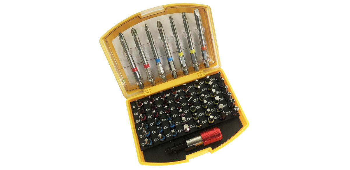 Wkretak z bitami: Bit 25mm: PH1, PH2, PH3, PZ1, PZ2, PZ3 - 3x SL4.0, SL5.0, SL6.0 - 2x T10mm, T15mm, T20mm, T25mm, T27mm, T30mm, T40mm - 2x TR10mm, TR15mm, TR20mm, TR25mm, TR27mm, TR30mm,TR40mm