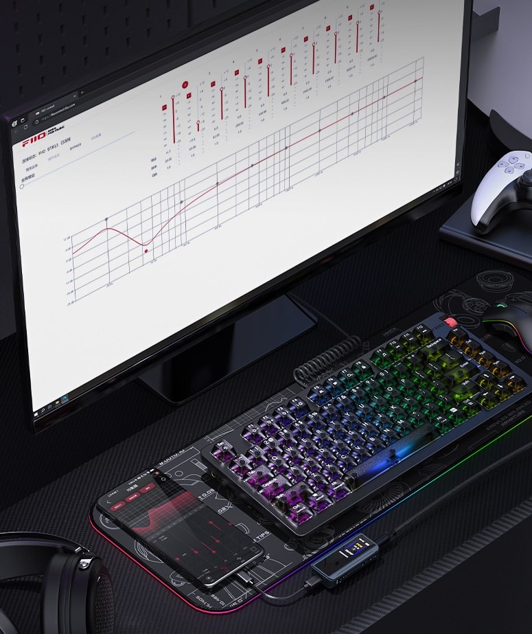 Dzięki globalnemu PEQ możesz precyzyjnie dostosować brzmienie. Algorytm FIIO oraz wbudowany DSP QCC5125 pozwalają na regulację korektora zarówno w trybie Bluetooth, jak i USB DAC.